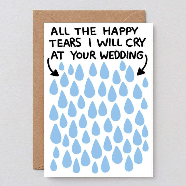 Some truths are best shared with love and laughter! This beautifully honest wedding card captures the raw emotion that comes with watching someone you care about tie the knot. Cari Vander Yacht's delicate hand-drawn illustration features countless little teardrops scattered across the card, with a simple arrow pointing to them and the wonderfully direct message: "all the tears i will cry at your wedding."