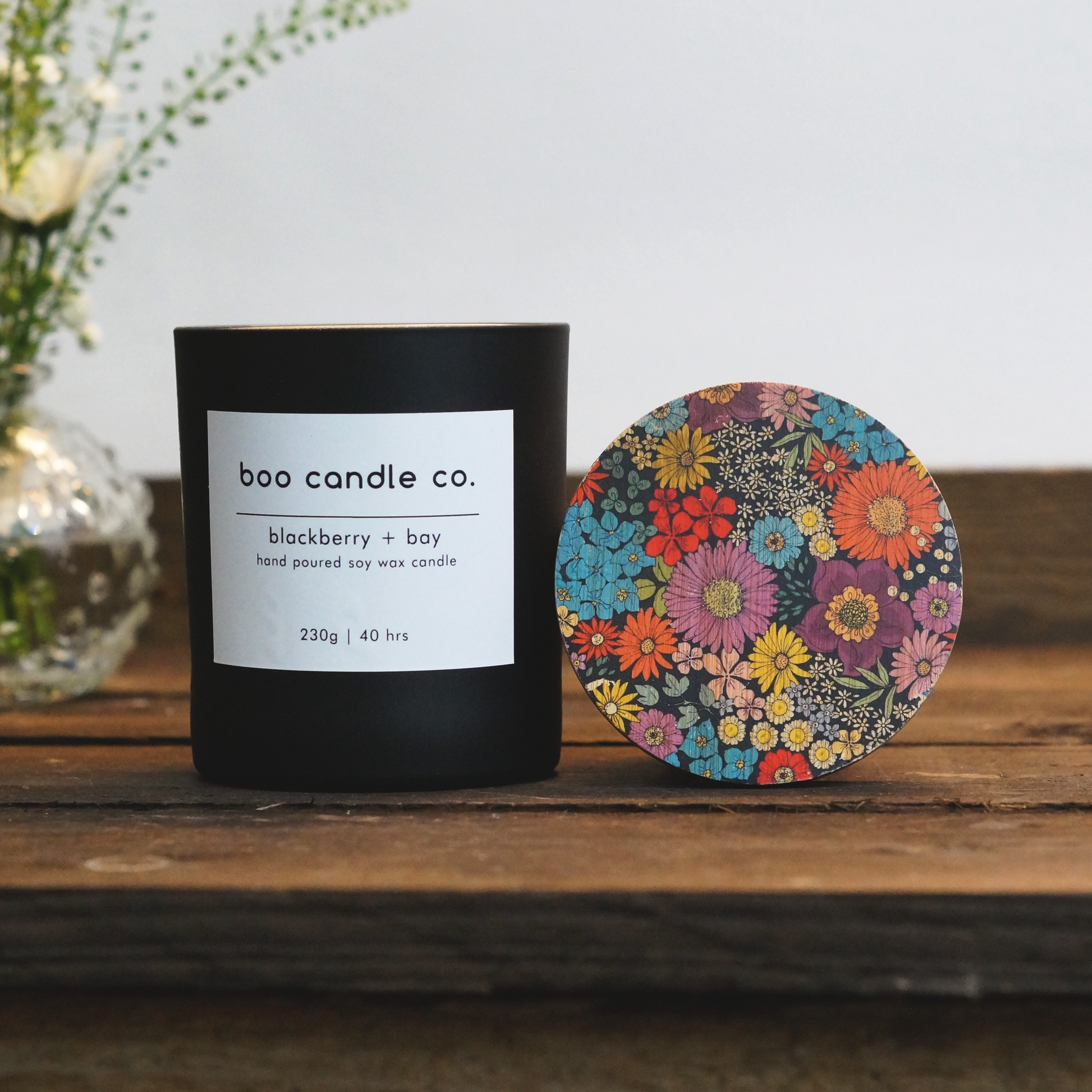 Blackberry + Bay Candle A fresh, fruity fragrance blending ripe blackberries and honeysuckle with leafy bay and orange blossom, grounded in sandalwood and cedar. Presented in a matte black vessel with decorative flowers.