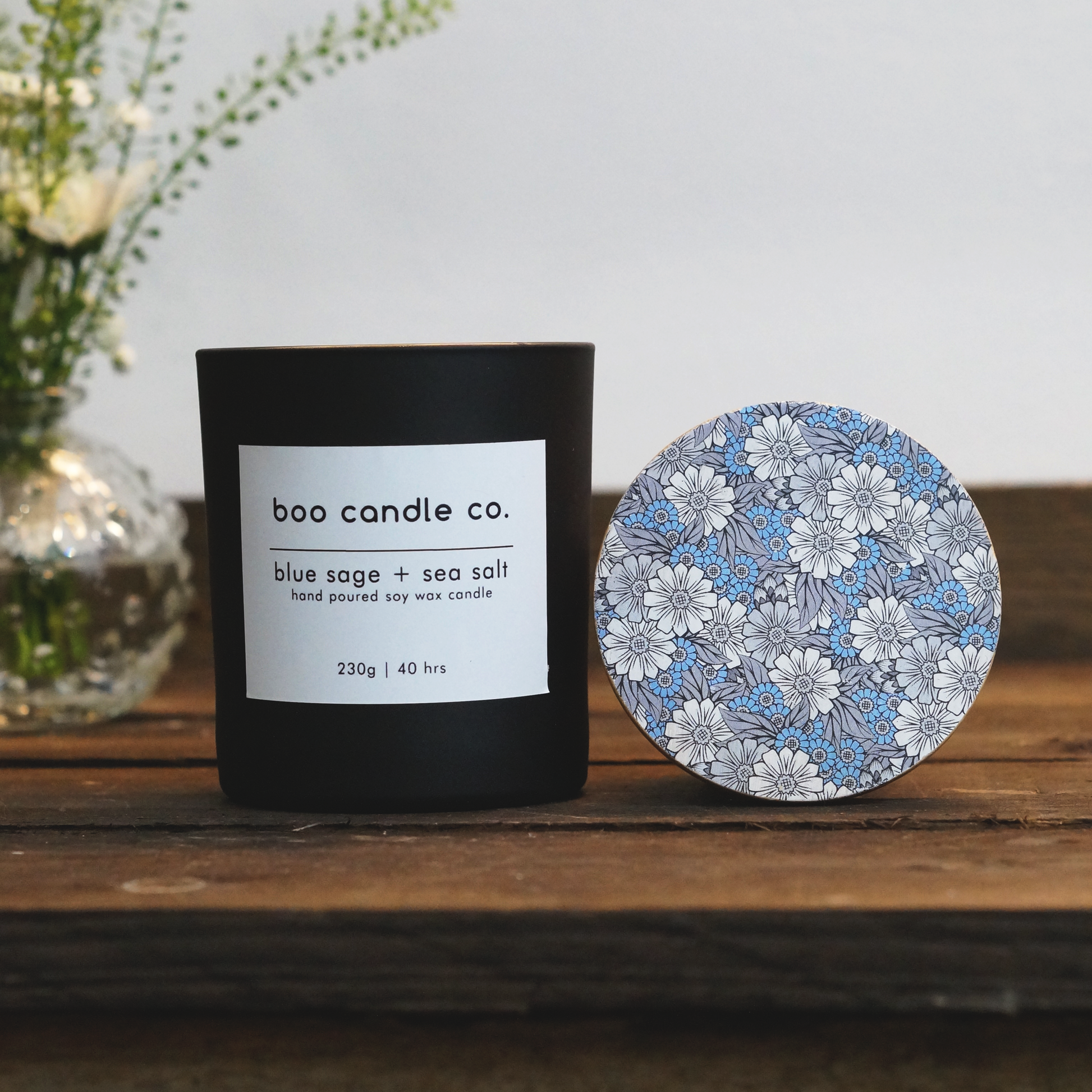 A refreshing blend of crisp sea air and herbaceous blue sage, brightened with grapefruit and grounded in calming musk. Presented in a matte white vessel with modern monochrome and pale blue pattern.