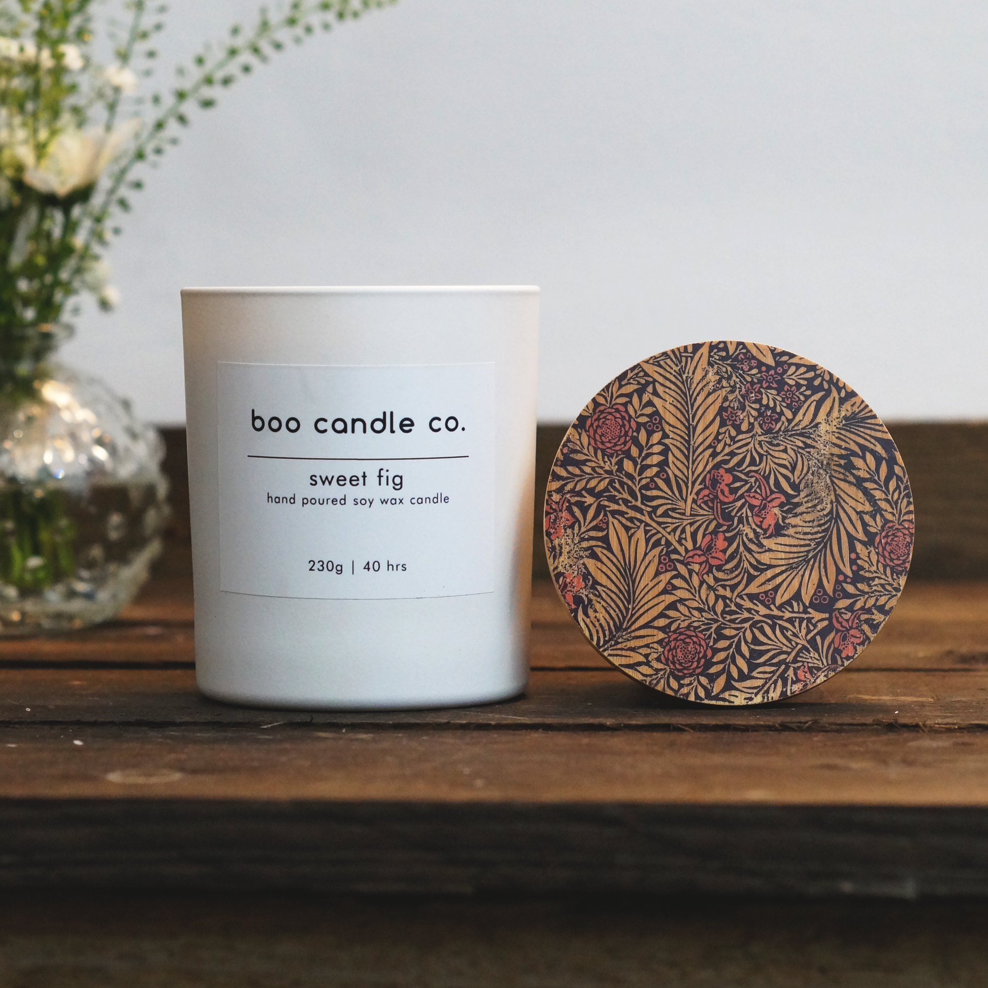 A late summer indulgence blending sweet black fig with grape, blackberry, clove and vanilla. This fruity, creamy fragrance carries subtle warming spices. Presented in a matte white vessel with William Morris' classic Larkspur print in plum.