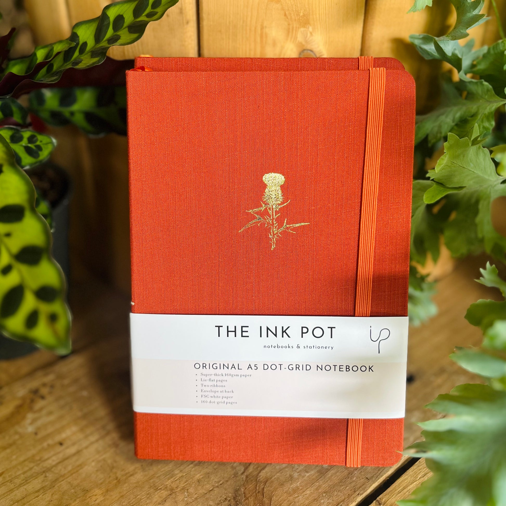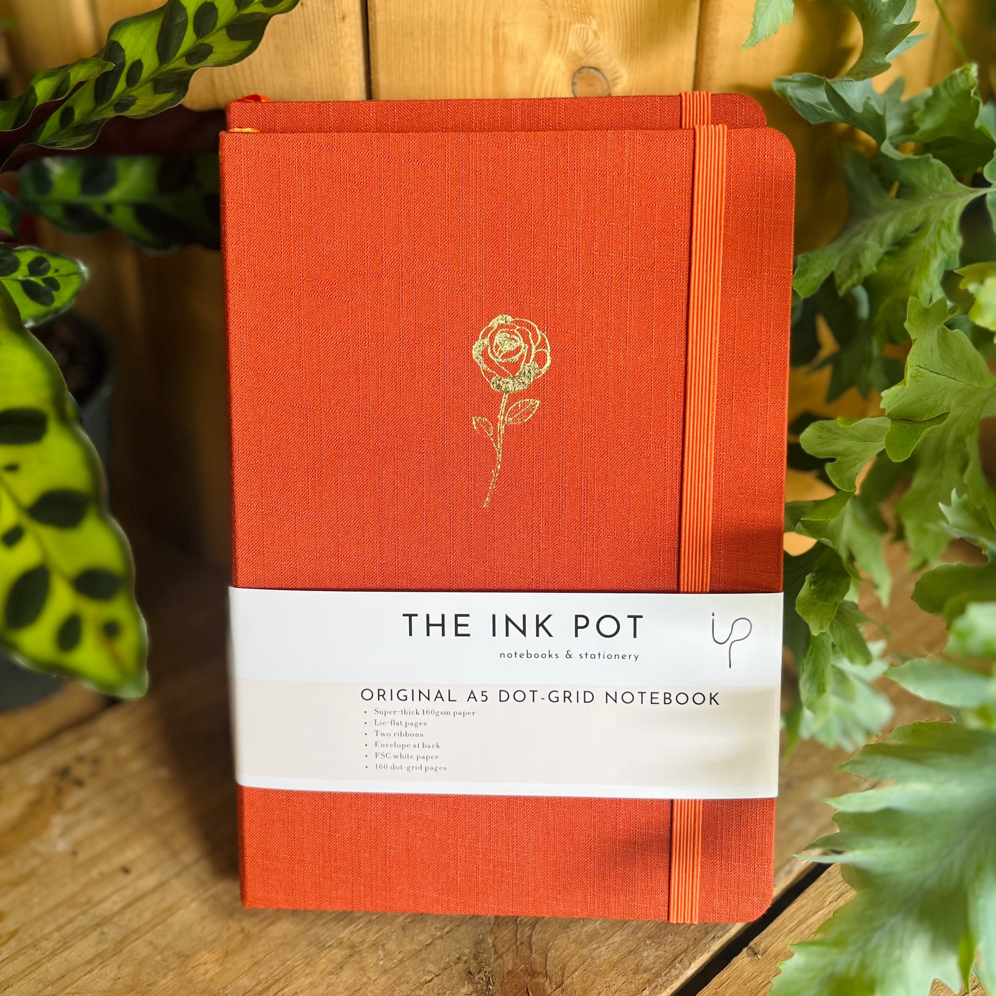Capture inspiration with our burnt orange bullet journal, featuring a delicate design and crisp white dotted pages.