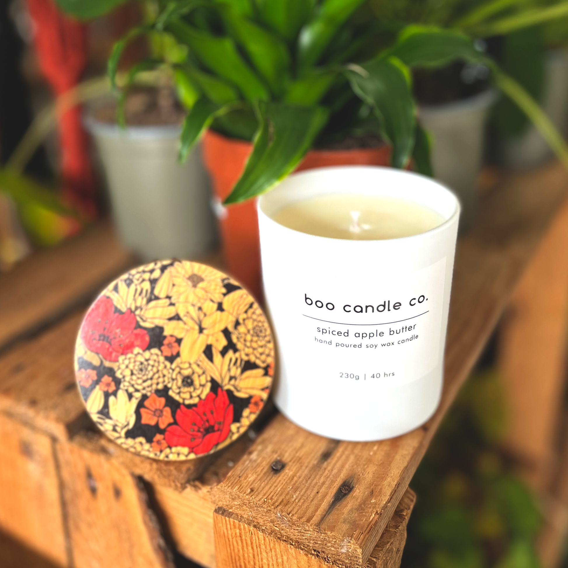 A cozy autumn blend of juicy apples and pumpkin with warming clove, cinnamon, and ginger, sweetened by maple syrup and vanilla. Presented in a matte white vessel with a nostalgic 70's-inspired floral lid in brown, red, and orange.