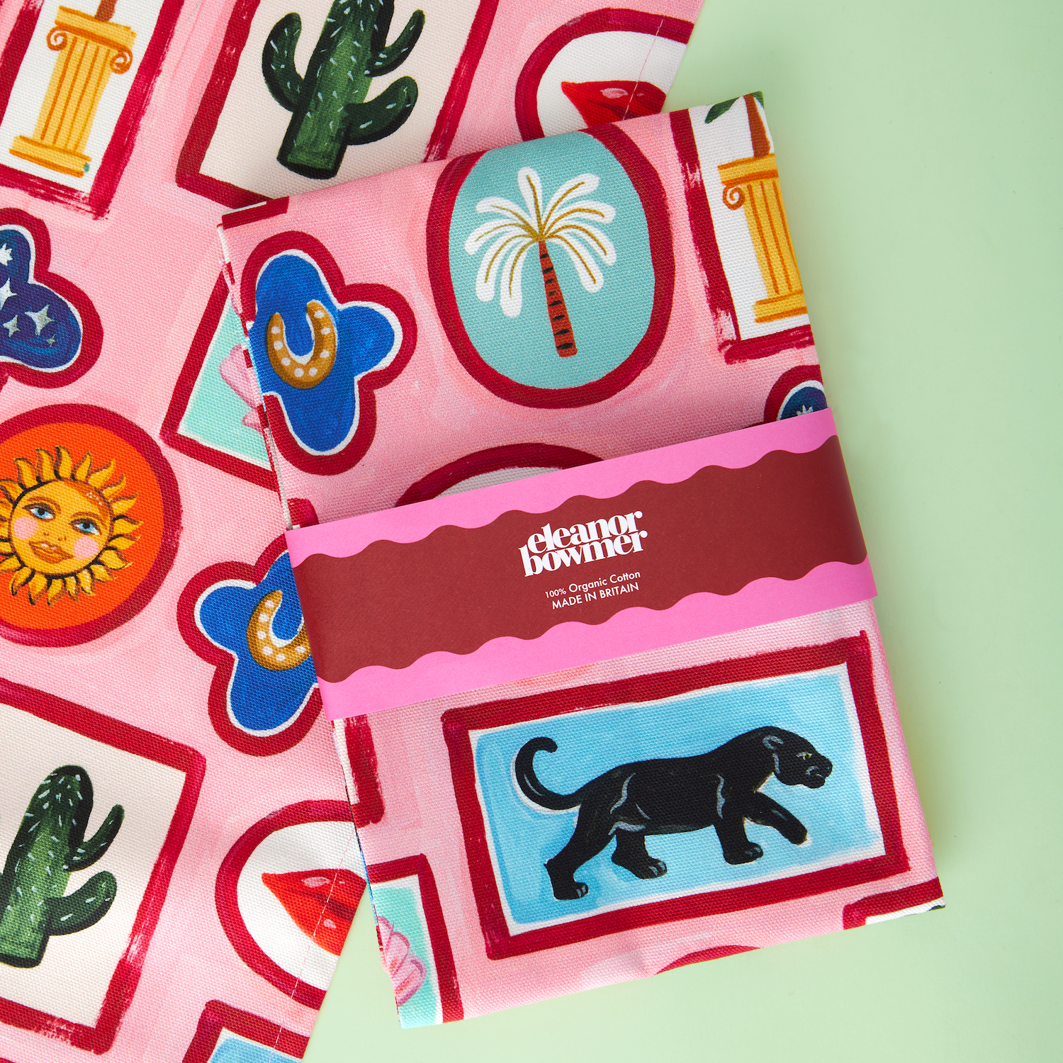 Bring a touch of West Coast sunshine to your kitchen with the Electric Coast Icon Tea Towel by Eleanor Bowmer. Featuring playful desert-inspired illustrations — from suns and cacti to palms and lips — this vibrant pink tea towel adds instant personality to your home.