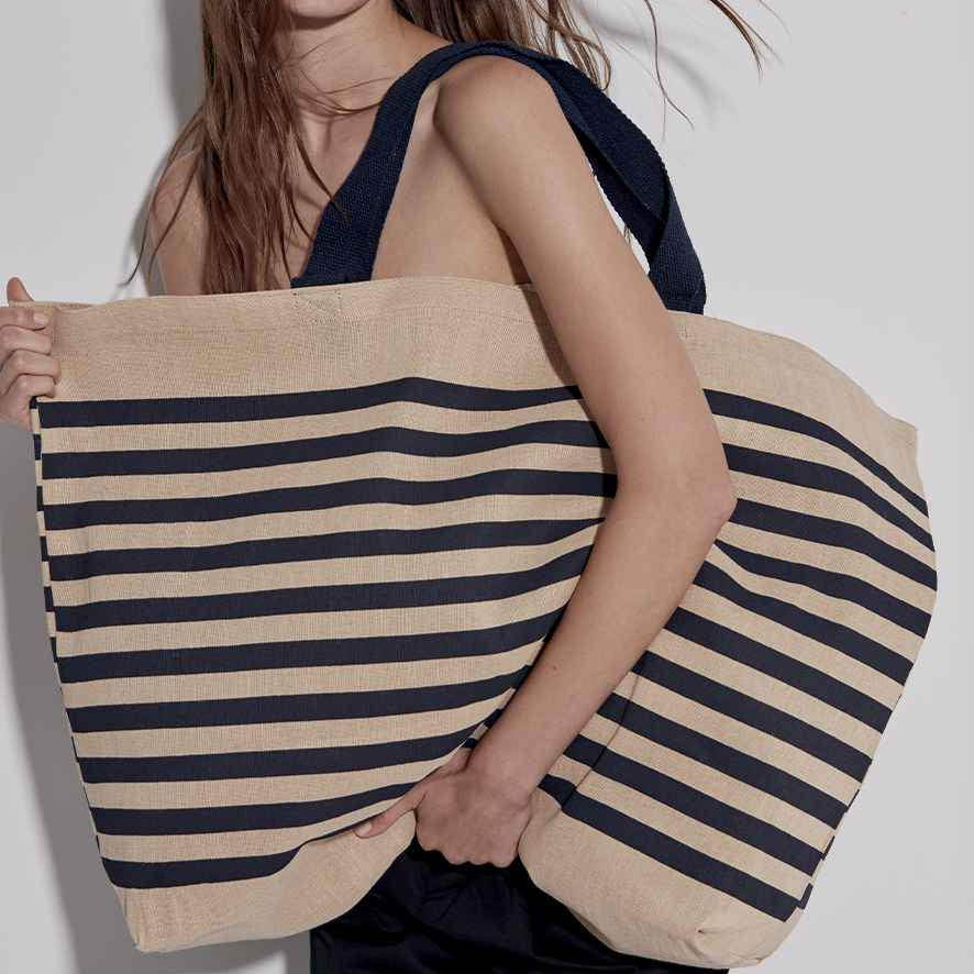 Crafted from premium jute canvas and cotton blend, our Large Juco Tote Bag combines rustic natural tones with sophisticated navy stripes for exceptional style and functionality in a generous 52-liter capacity. This spacious companion features comfortable 55cm carry/shoulder straps for easy transport, striking contrast striped detailing, and measures an impressive 48cm x 72cm x 15cm—perfect for shopping trips, beach days, weekend markets, or as an eco-friendly everyday carryall.