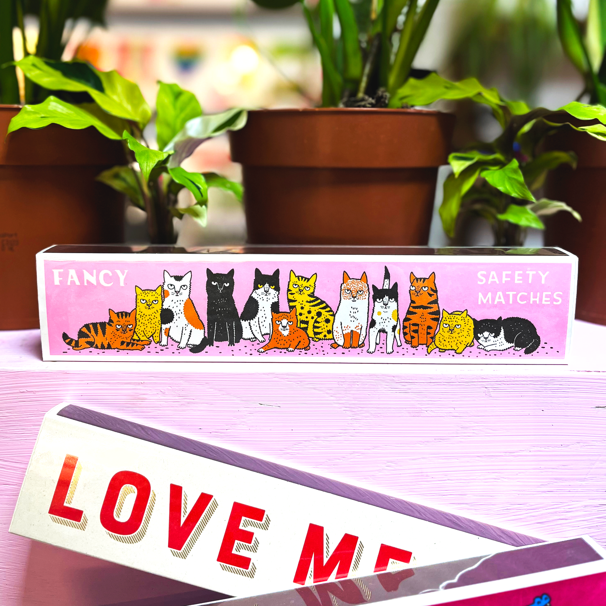 Elevate your lighting routine with these vintage-inspired matches, featuring charming hand-drawn cats in muted, classic colors. Each match is carefully crafted with a sturdy wooden stem and reliable strike surface.