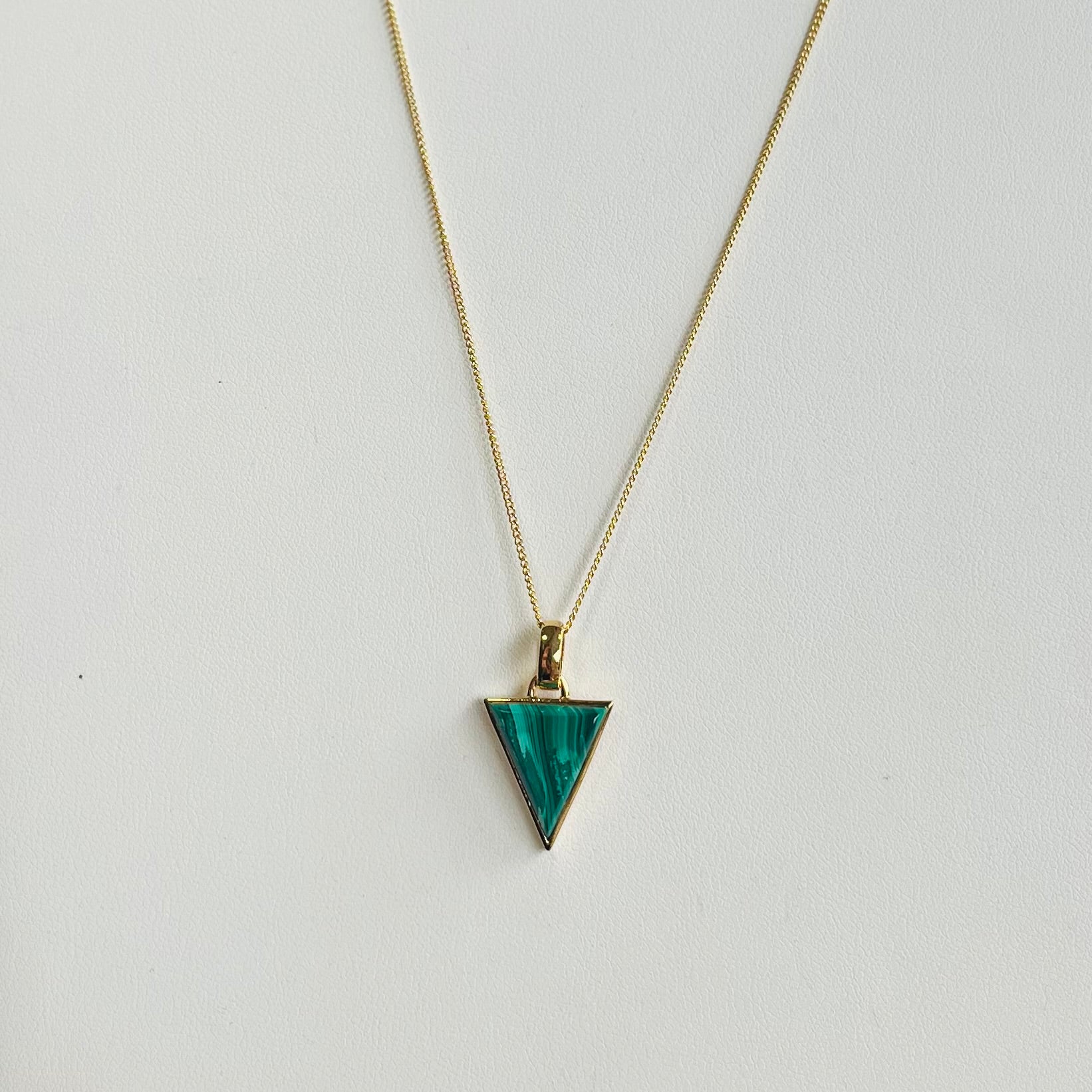 Adorn yourself with understated luxury with our gold-plated necklace featuring a striking triangular malachite pendant. This piece effortlessly blends modern geometry with natural beauty.