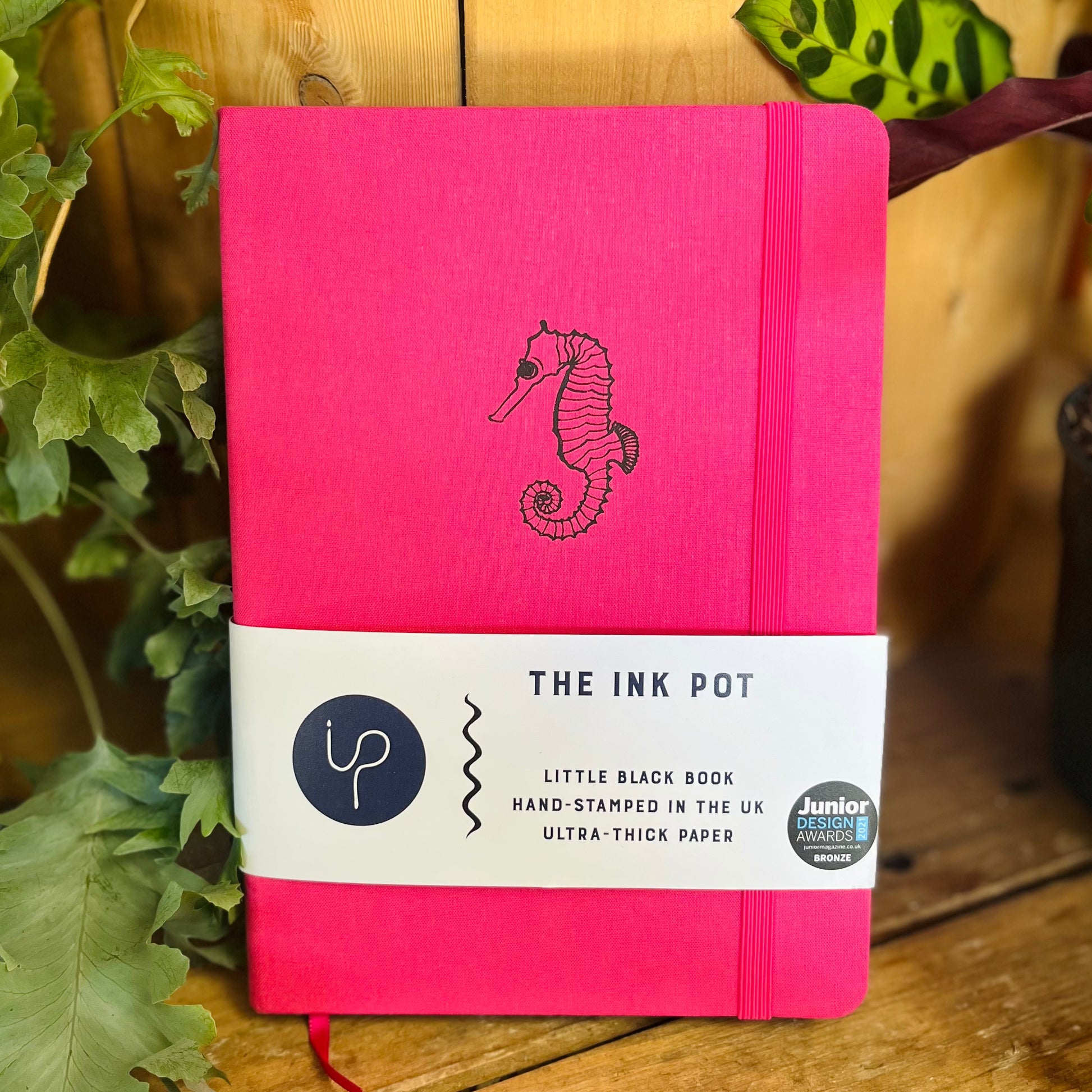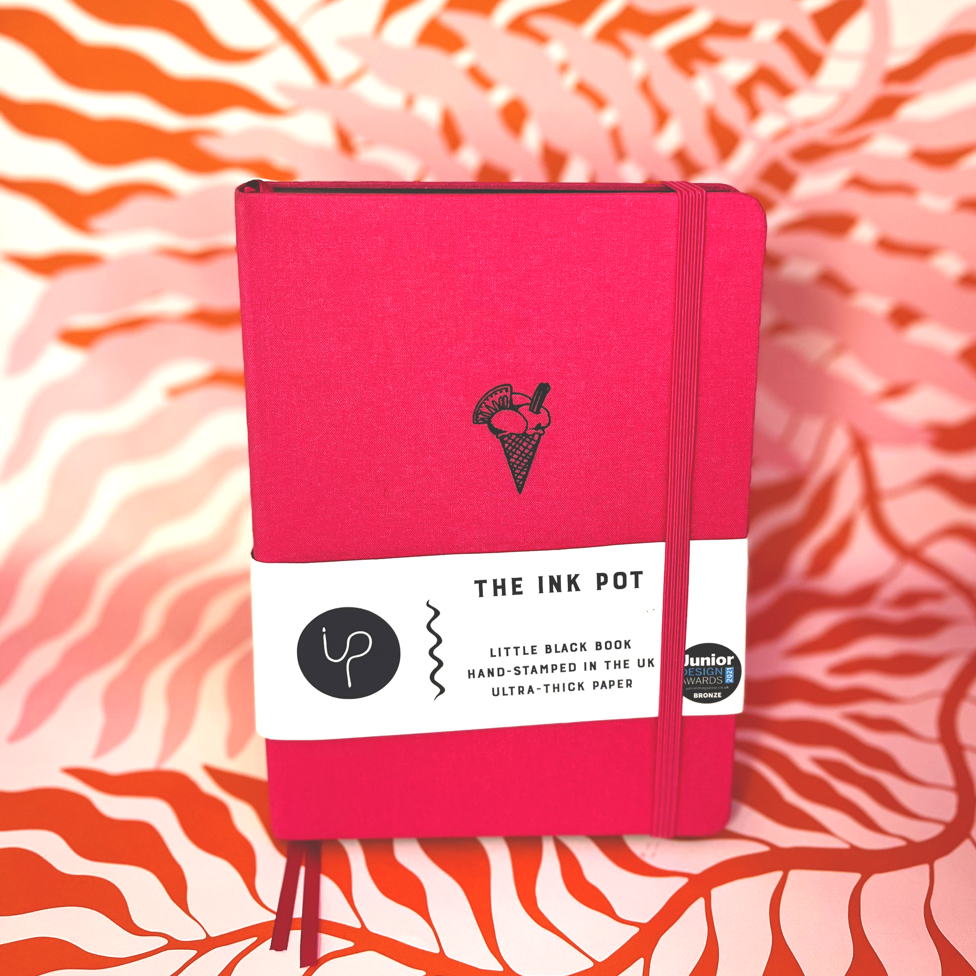 From The Ink Pot collection, this striking journal pairs black pages with a vibrant fuchsia linen cover, adorned with a playful design.