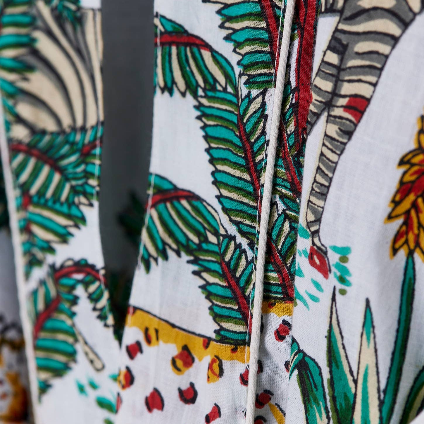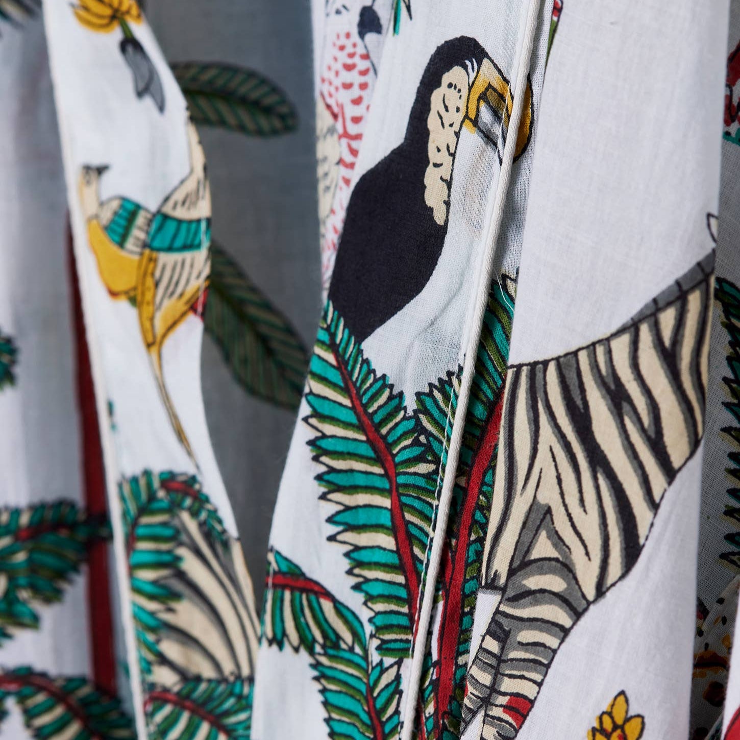 Hand-printed on exotic white cotton (also available in blue, jade, and pink), this wrap-around robe features a vibrant wonderland of lush plant life, exotic birds, and majestic big cats. Elegant white detailing adorns the cuffs, collar, front seams, and side hip pockets. One size fits all with roomy sleeves for ultimate comfort. Each piece showcases authentic Indian artisanship through traditional screen printing techniques, creating unique variations that highlight the craftsperson's skill. 100% cotton. Machine washable on gentle cycle.