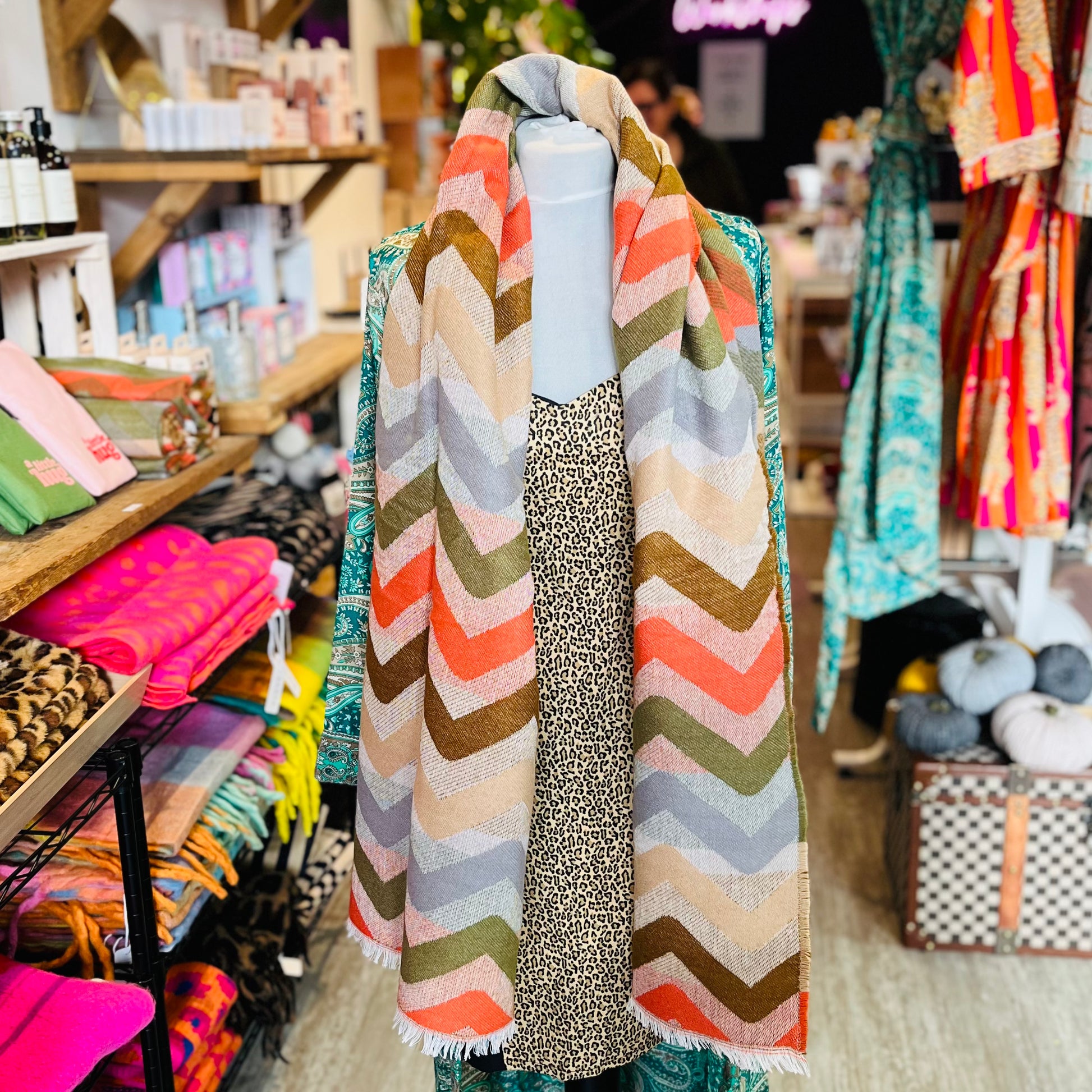 Inject playful texture into your winter wardrobe with our Khaki Orange Zig Zag Scarf, a cosy and stylish blanket scarf designed for warmth and comfort. Crafted from soft, woven polyester yarn, this heavyweight scarf features a contrasting zig zag striped pattern and a delicate fringed edge, adding a touch of modern sophistication to your seasonal outfits. Effortlessly pair it with coats, jackets, or knitwear for a chic, statement-making winter look.