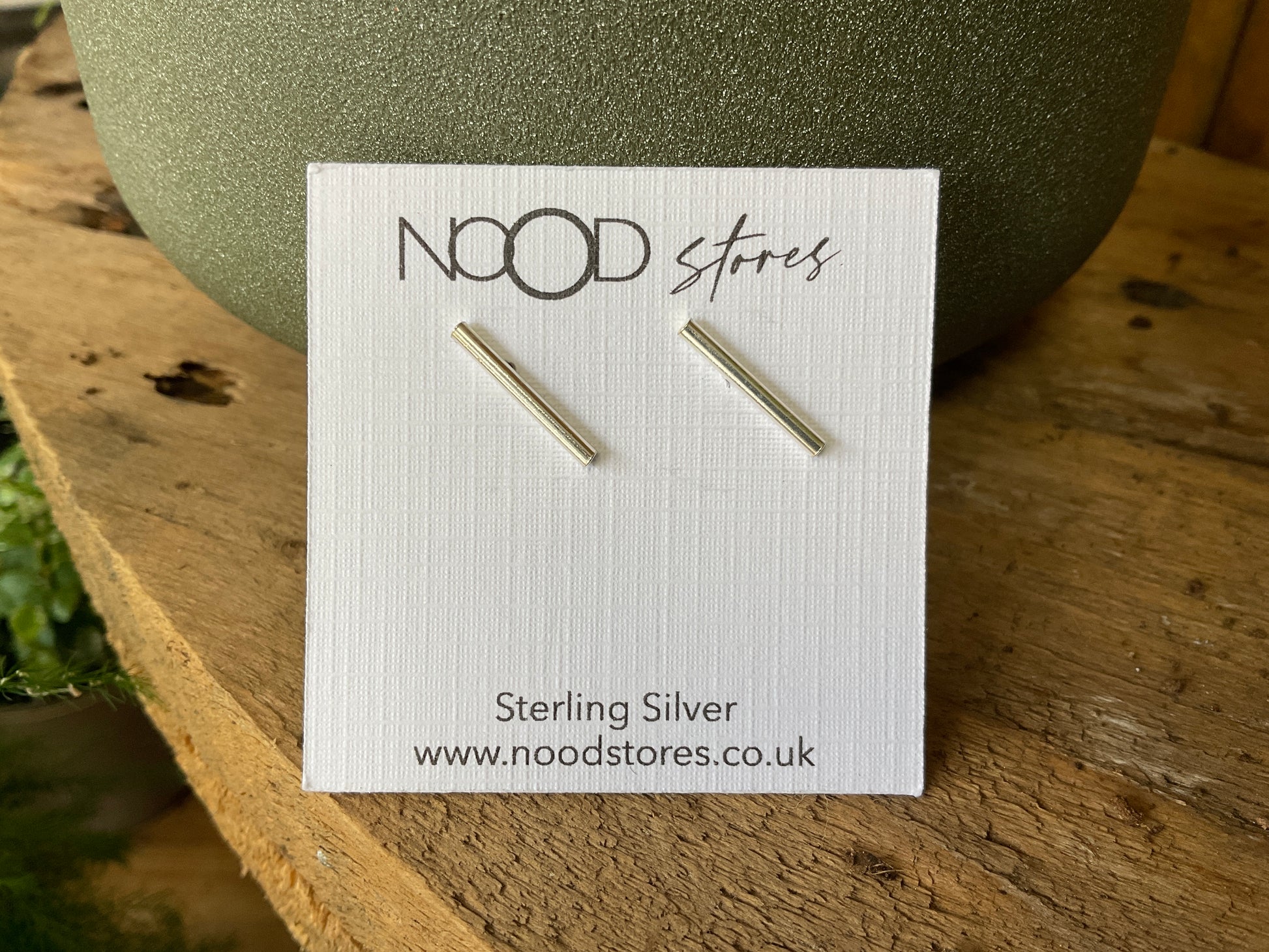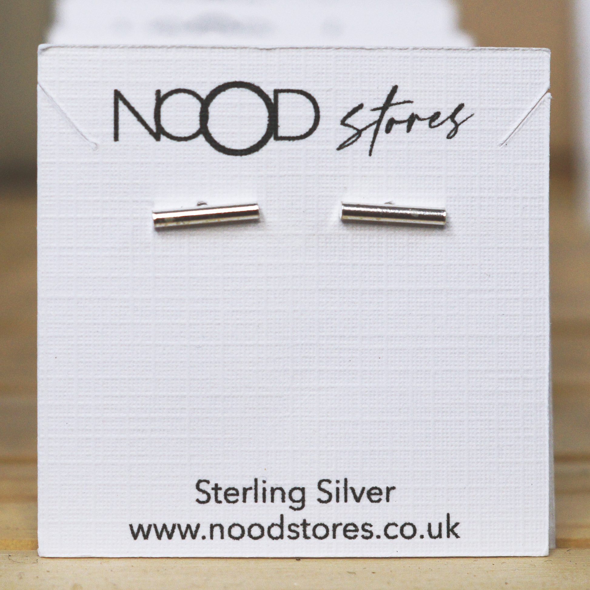 Sterling silver stud earrings featuring sleek cylinder design. These understated bars offer versatile style.
