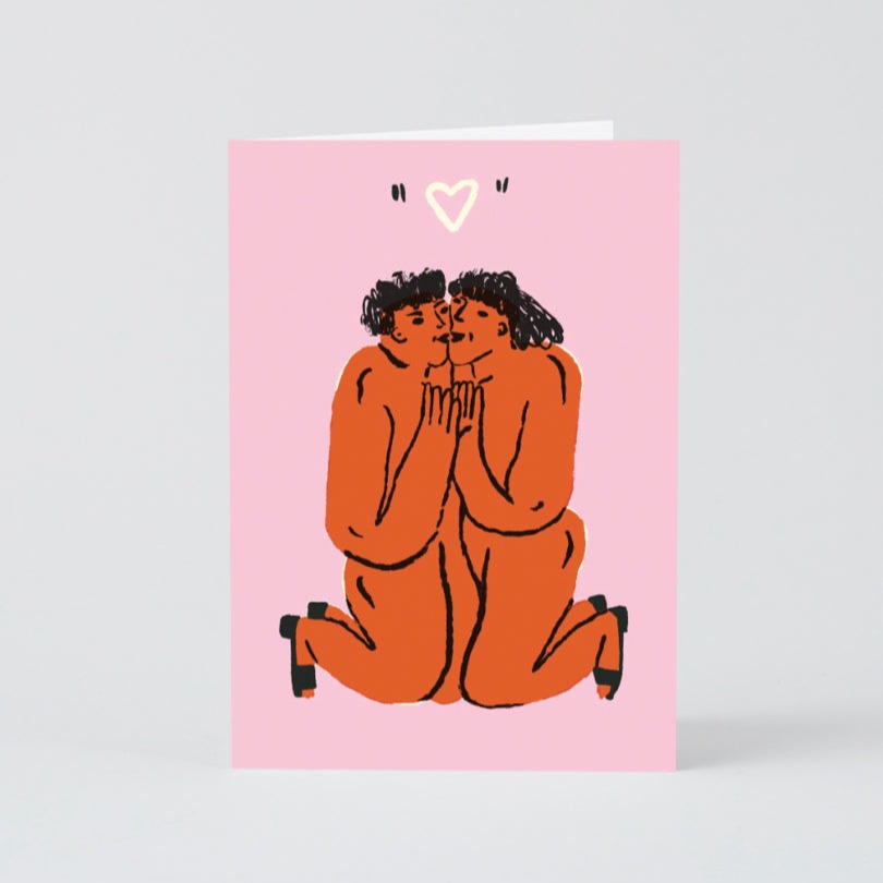 A passionate pair, playfully illustrated by Rozalina Burkova in blushing pink and red. Packed with a light cream envelope.