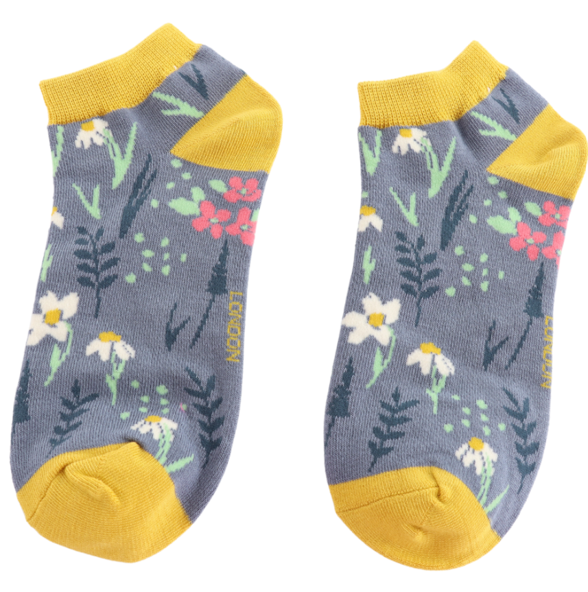 Embrace floral charm with these soft denim blue trainer socks adorned with a beautiful meadow pattern.
