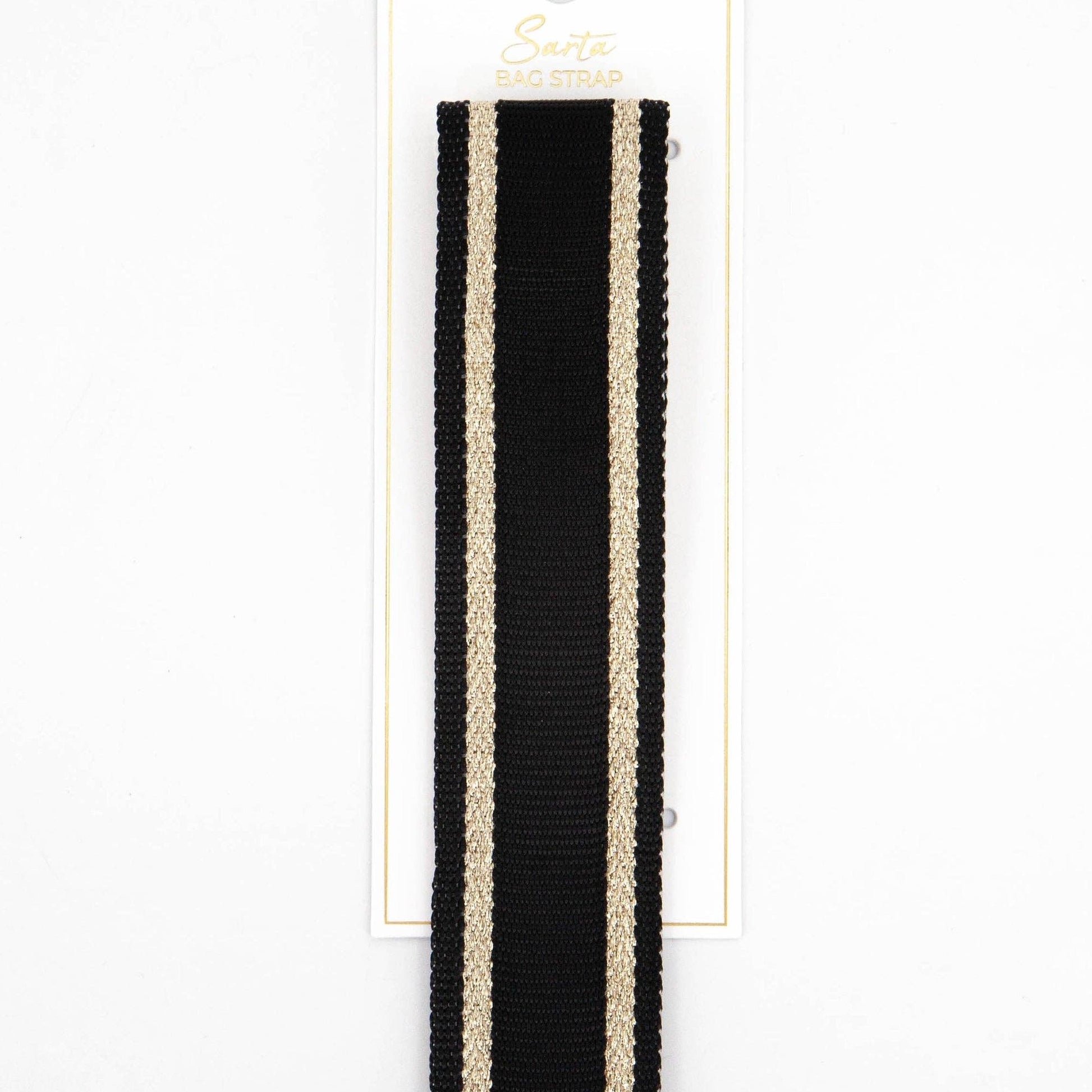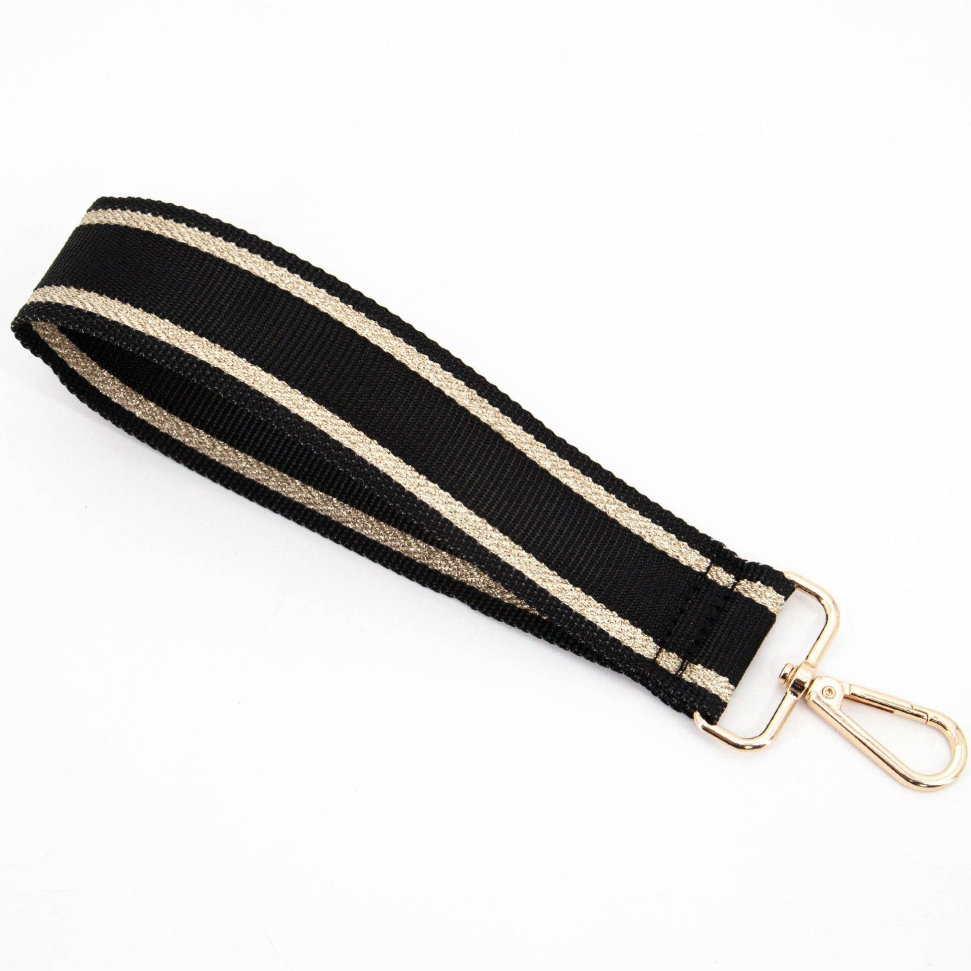 Add a touch of refined glamour to your accessories with our sophisticated wrist strap, featuring a classic black woven texture enhanced by a subtle gold metallic stripe border and complemented by premium gold hardware.
