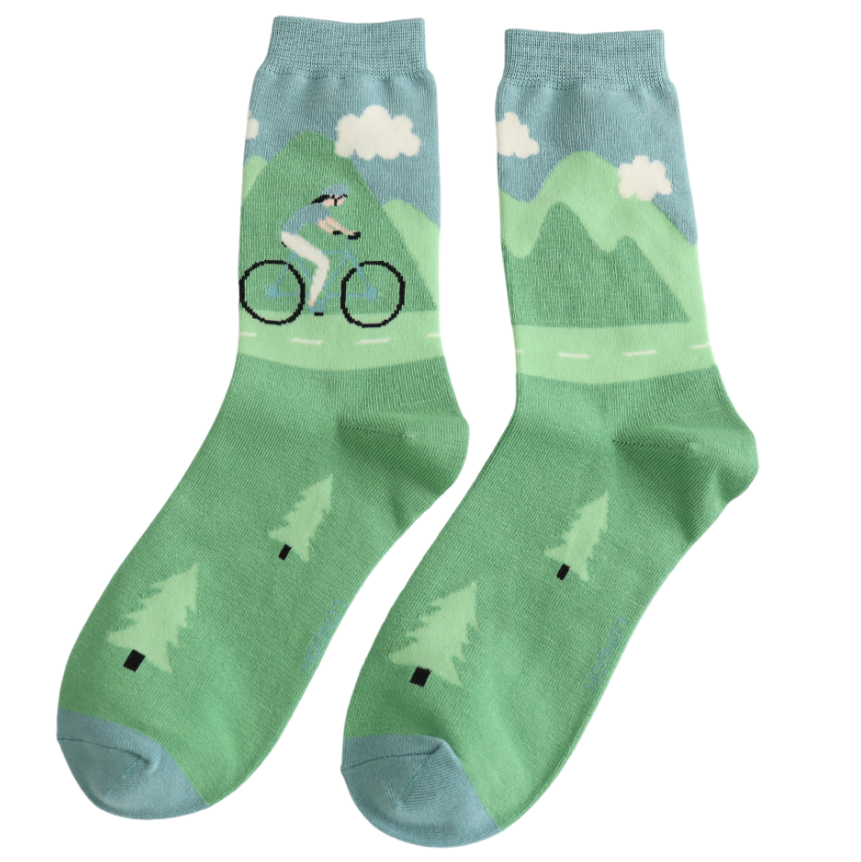 Our Blue Bamboo Mountain Biking Socks blend style and performance with a playful cyclist-in-mountains design. Made from premium bamboo fibers, these socks deliver exceptional comfort for active women.