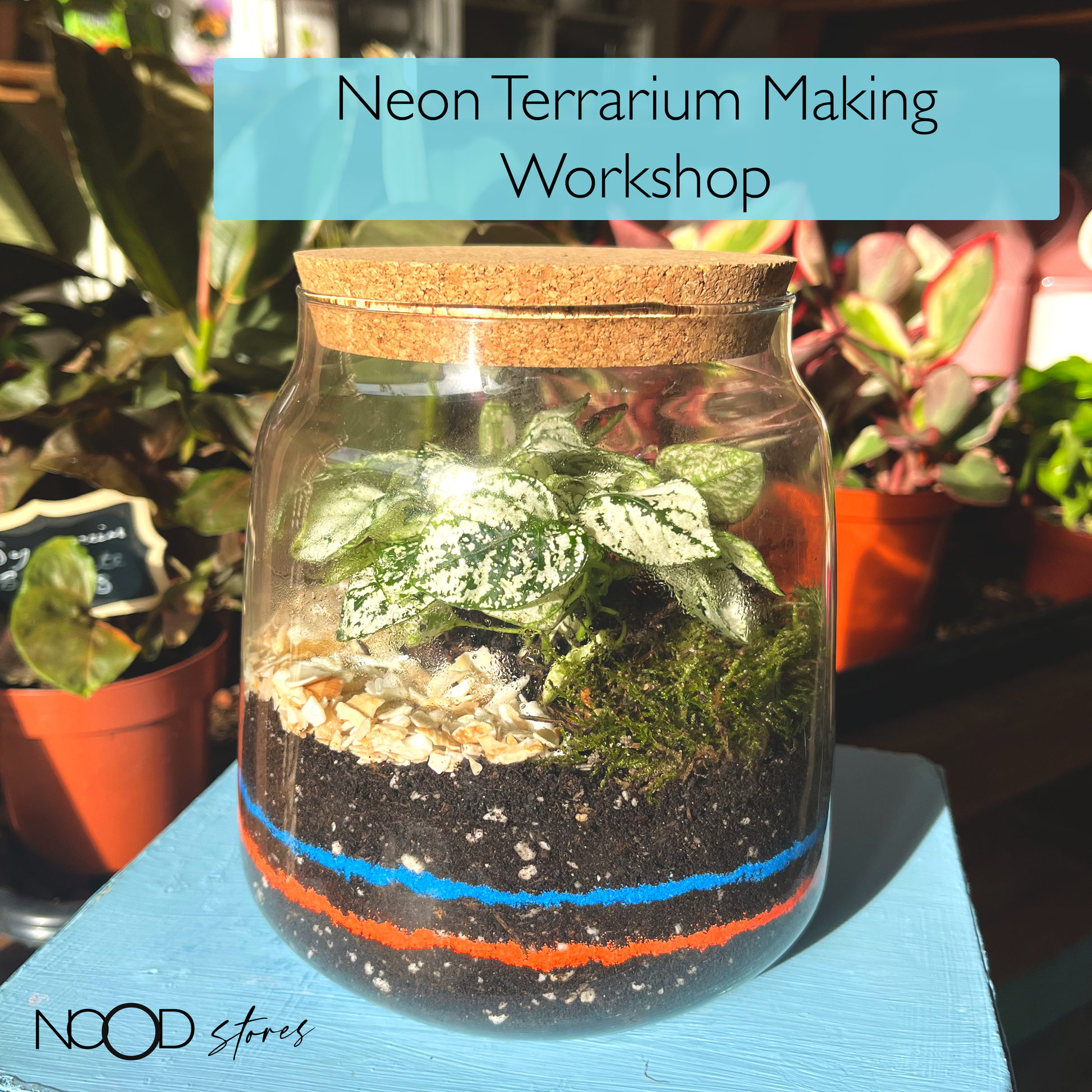 You will be guided to create a terrarium full of humid loving plants, landscaped by your own choosing with bark, shells, and rock delicately adding in neon layers to give it a huge wow factor.