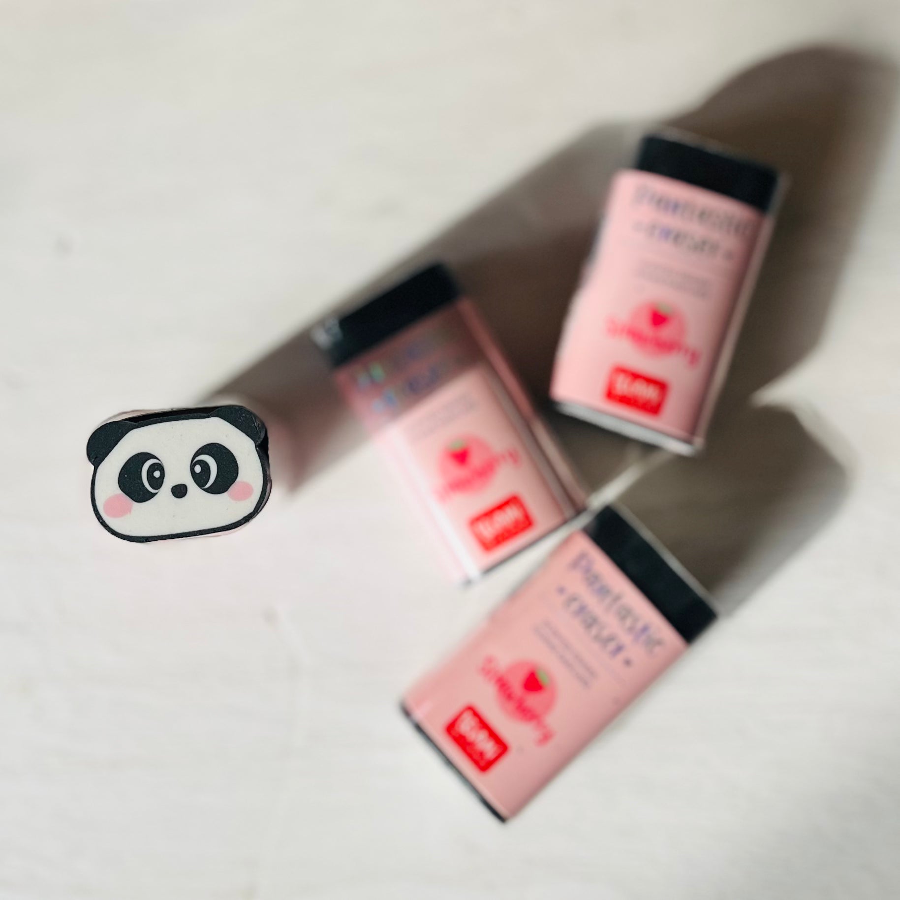 Delightful panda eraser with charming cartoon face, infused with strawberry scent.