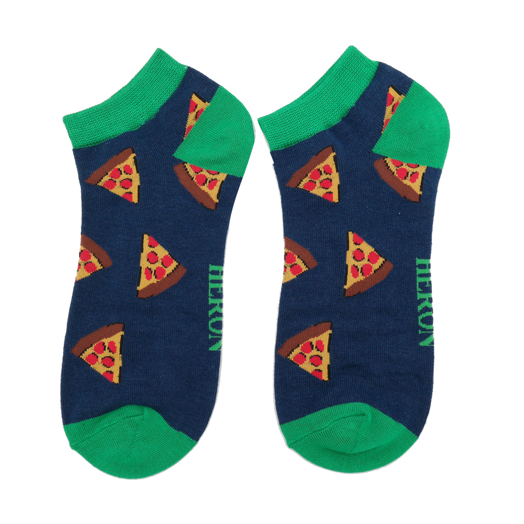 Pizza Slices bamboo trainer socks featuring dark blue background with pepperoni pizza slice pattern and green trim.