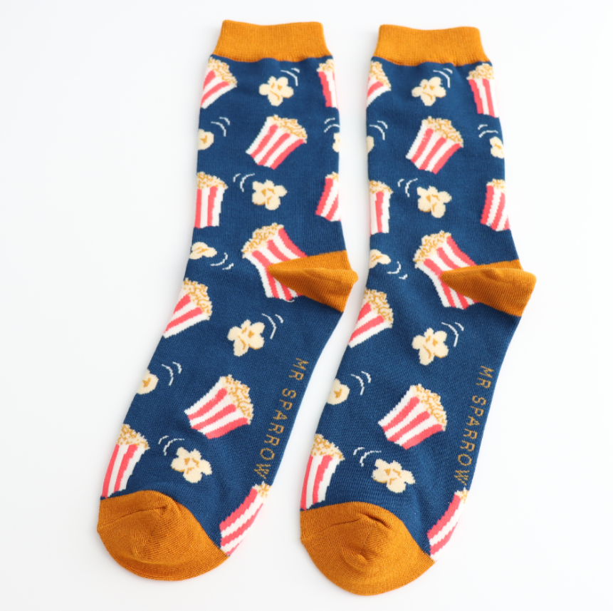 Add a playful touch to your wardrobe with these charming navy socks featuring adorable striped popcorn buckets.