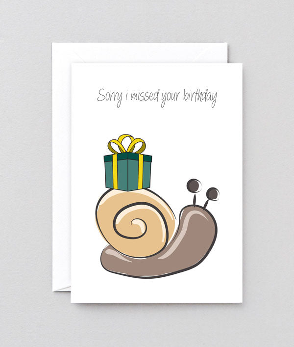 Perfect for belated birthday wishes! This card features a cute cartoon snail carrying a gift on its shell with "Sorry I missed your birthday!" text.
