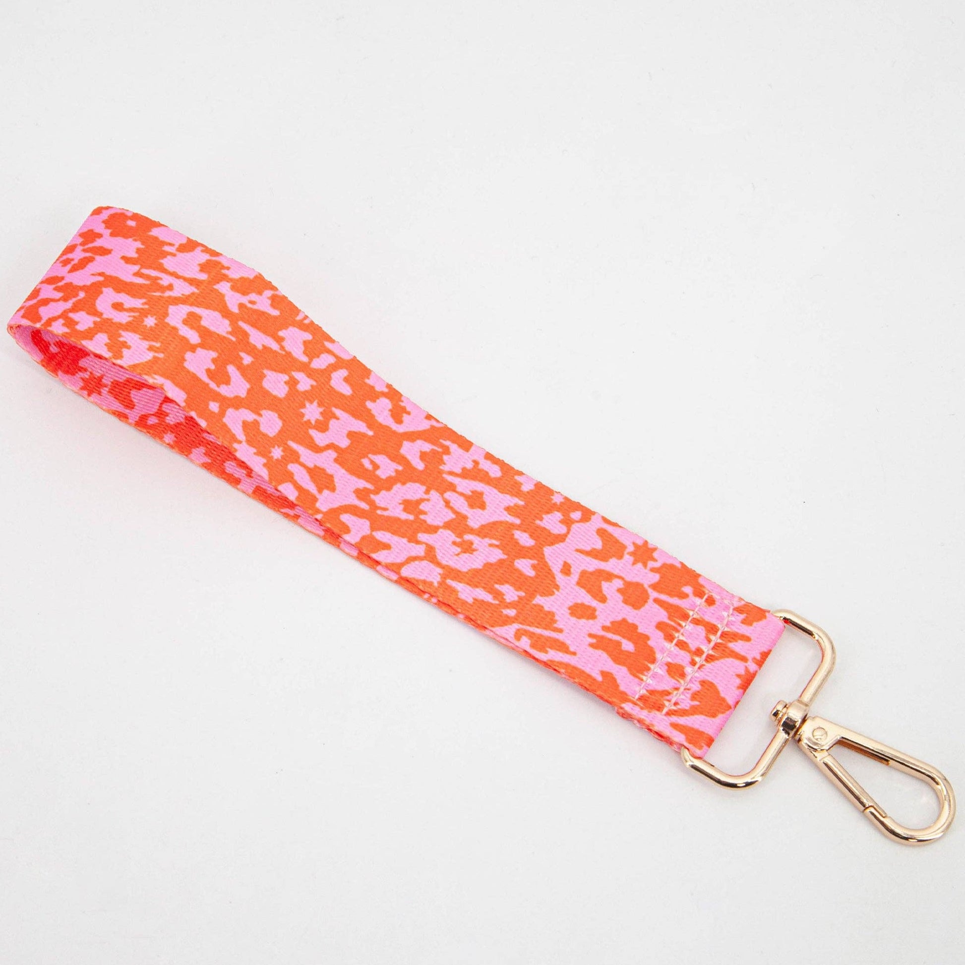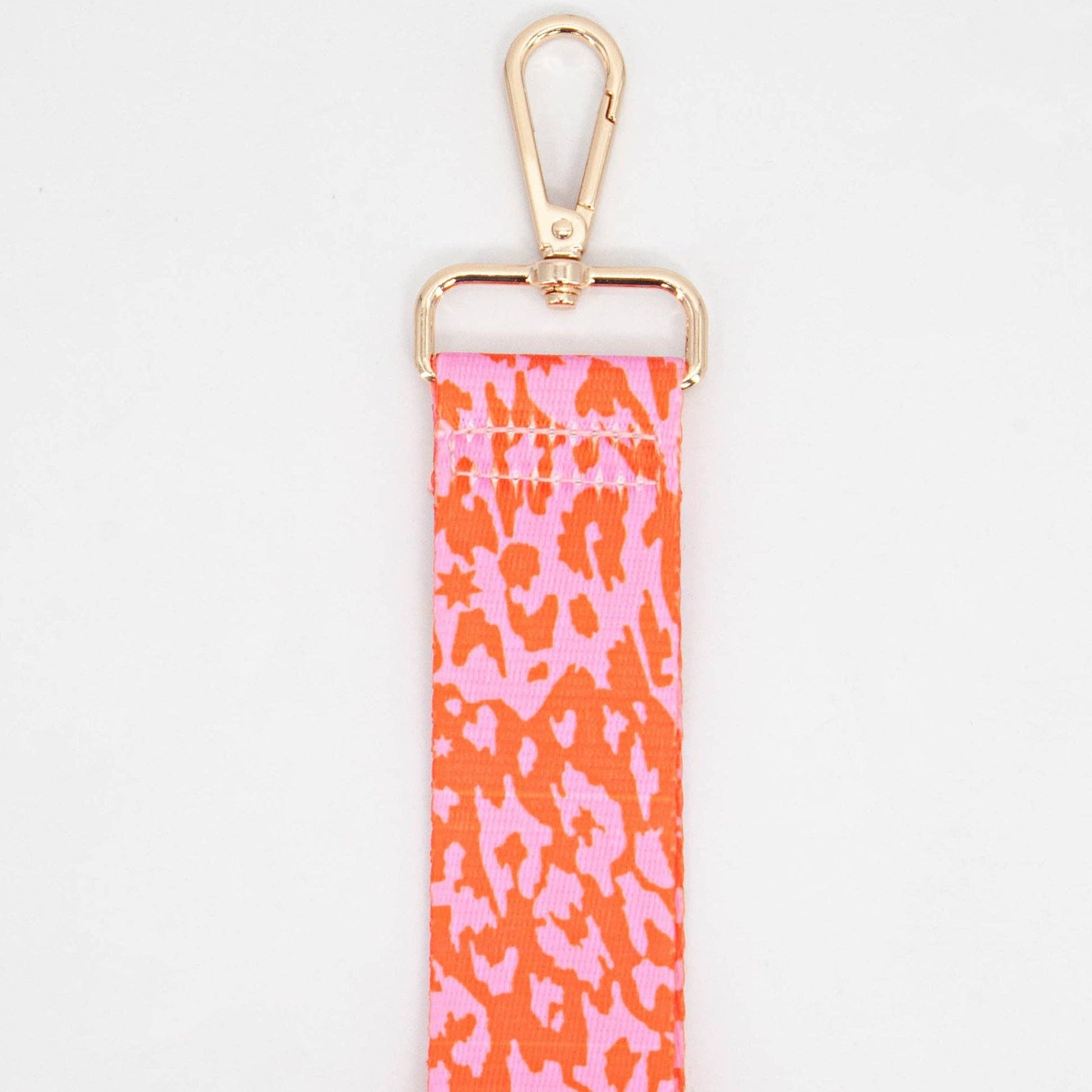 Elevate your everyday essentials with our eye-catching wrist strap featuring a playful animal print in vibrant pink and orange, adorned with subtle star accents and finished with premium gold hardware.