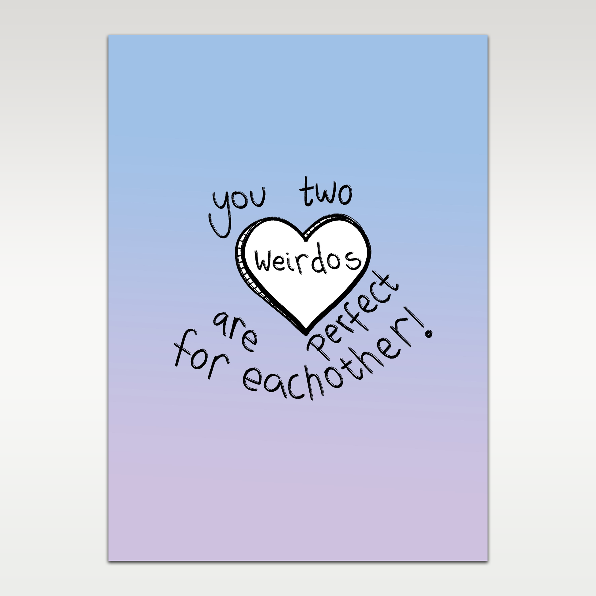 Celebrate quirky love with NOOD Stores' engagement/wedding card featuring a purple-blue gradient background and a heart illustration declaring "You two weirdos are perfect for each other.