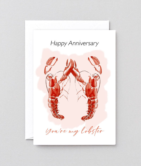 Our 'You're my Lobster' anniversary card features a sweet illustration of two lobsters holding claws against a clean white background.